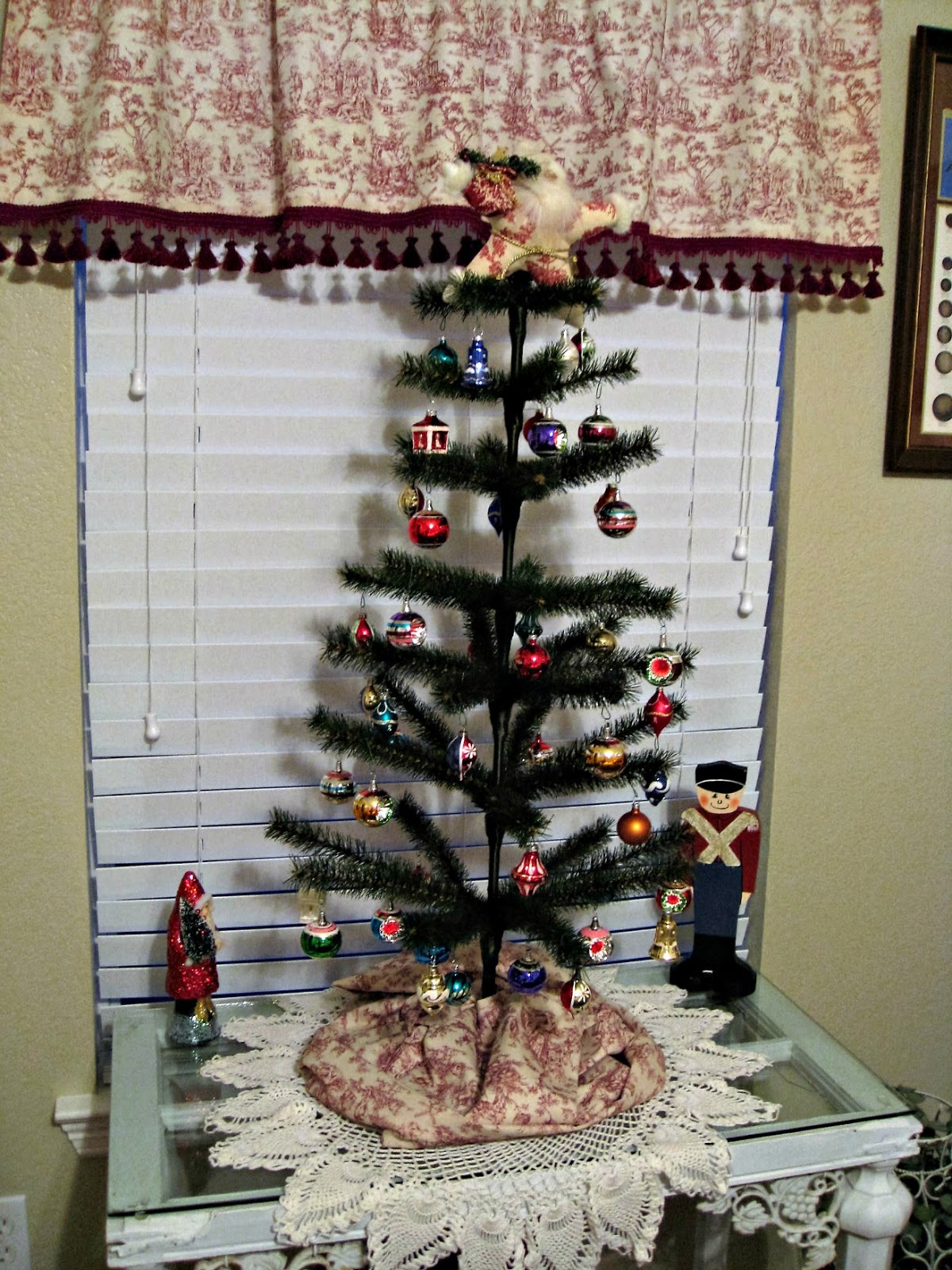 This little tree is in the other guest room on a bookcase that is between the twin beds. It stays up all year and I change the ornaments for the seasons (unless it is a season I don't have ornaments for yet - then it is just bare)